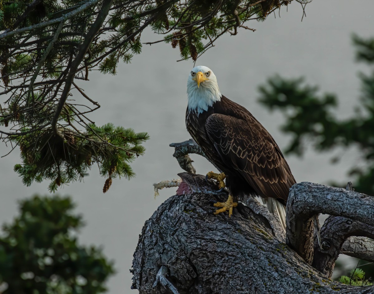 The Bald Eagle is a large bird, with a body length of 28–40 in, and a wingspan of up to 96 in. The  It reaches speeds of 56–70 kilometers per hour when gliding and flapping, and its dive speed is between 120–160 kilometers per hour. The Bald Eagle’s diet is opportunistic and varied, but most feed mainly on fish. In the Pacific Northwest, spawning trout and salmon provide most of the Bald Eagles’ diet. The Bald Eagle is a sacred bird in some North American cultures, and its feathers, like those of the Golden Eagle, are central to many religious and spiritual customs among Native Americans. Eagles are considered spiritual messengers between gods and humans by some cultures. Many pow wow dancers use the eagle claw as part of their regalia as well.